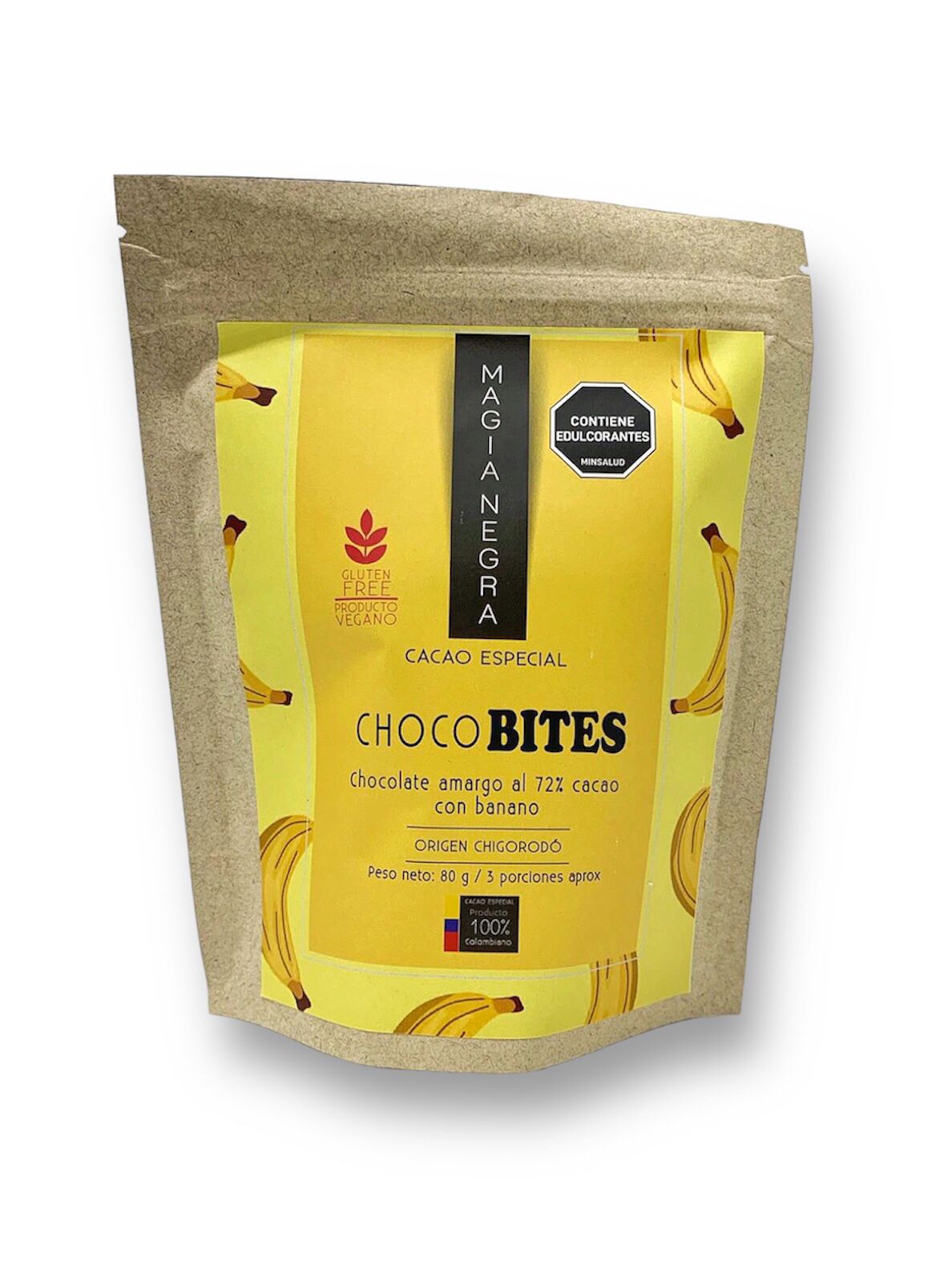 Snack de trozos de banano deshidratados cubiertos con chocolate al 72% cacao sin azúcares añadidos.